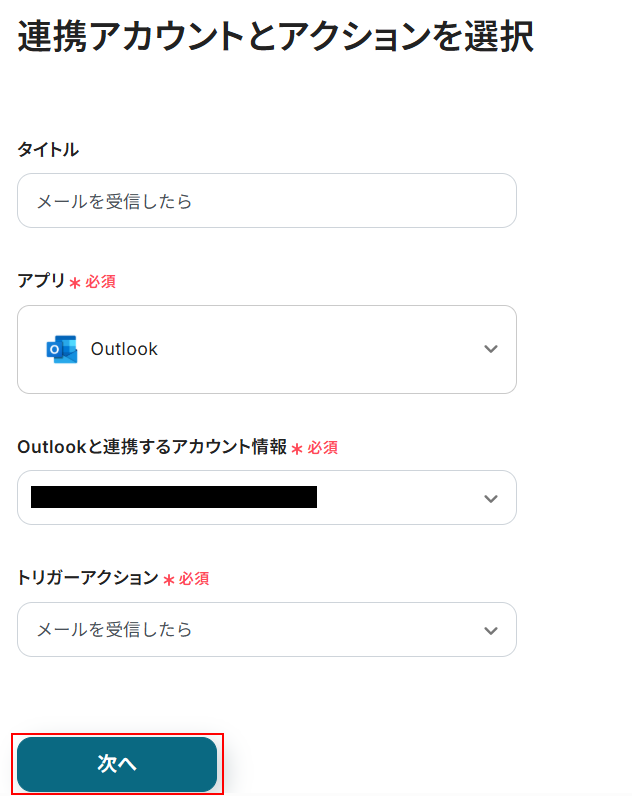 Outlookと連携するアカウント情報を確認し、問題なければ「次へ」をクリックします。