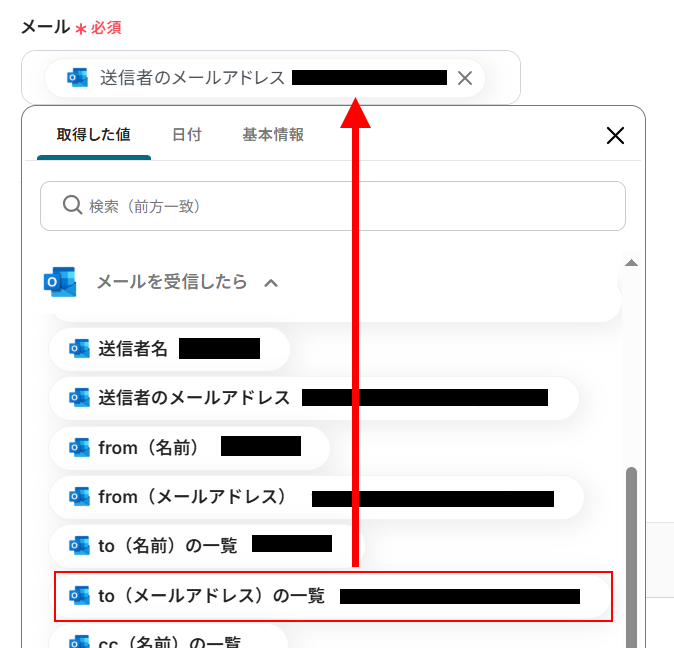 デフォルトで送信者のメールアドレスが設定されていますが、こちらも先ほどと同様に入力欄をクリックすることで、取得した値から選択することも可能です。