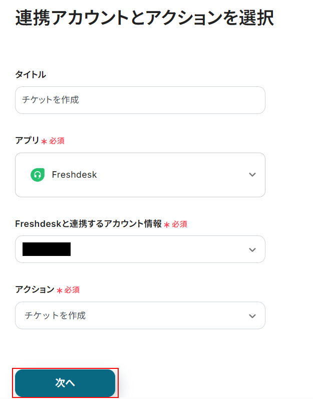 Freshdeskと連携するアカウント情報を確認し、問題なければ「次へ」をクリックします。