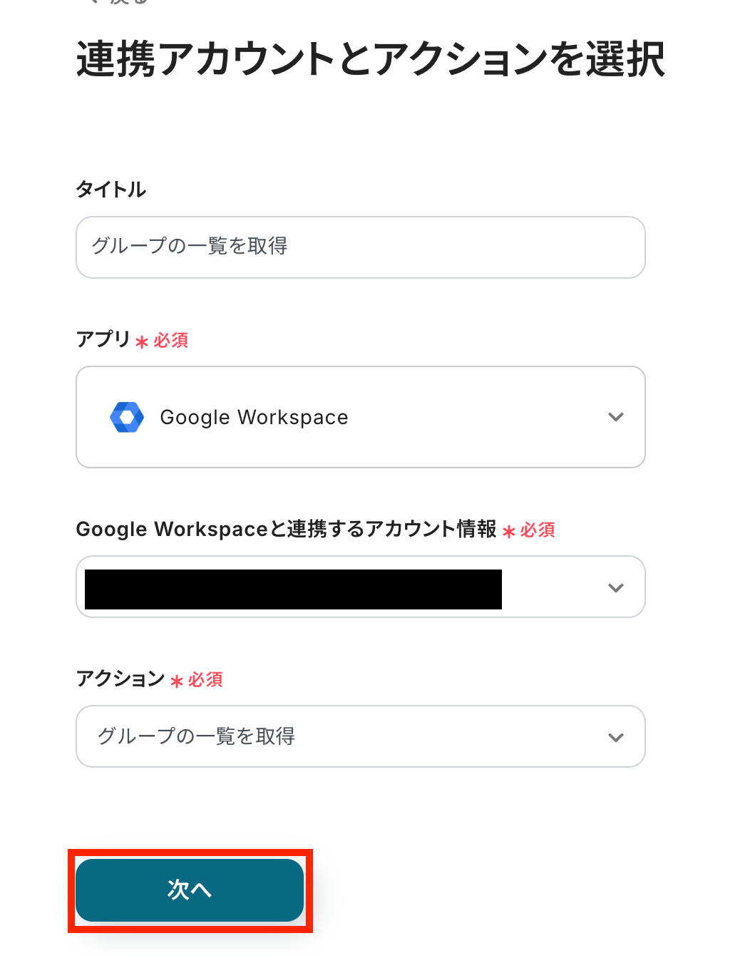 Google Workspaceにてグループの一覧を取得するアクションを設定します。