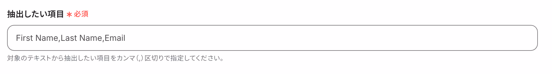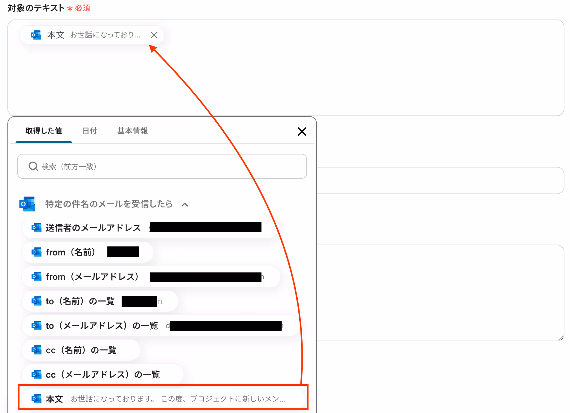 ここでは、Outlookのトリガー設定で取得したアウトプットからデータを抽出する設定を行います。