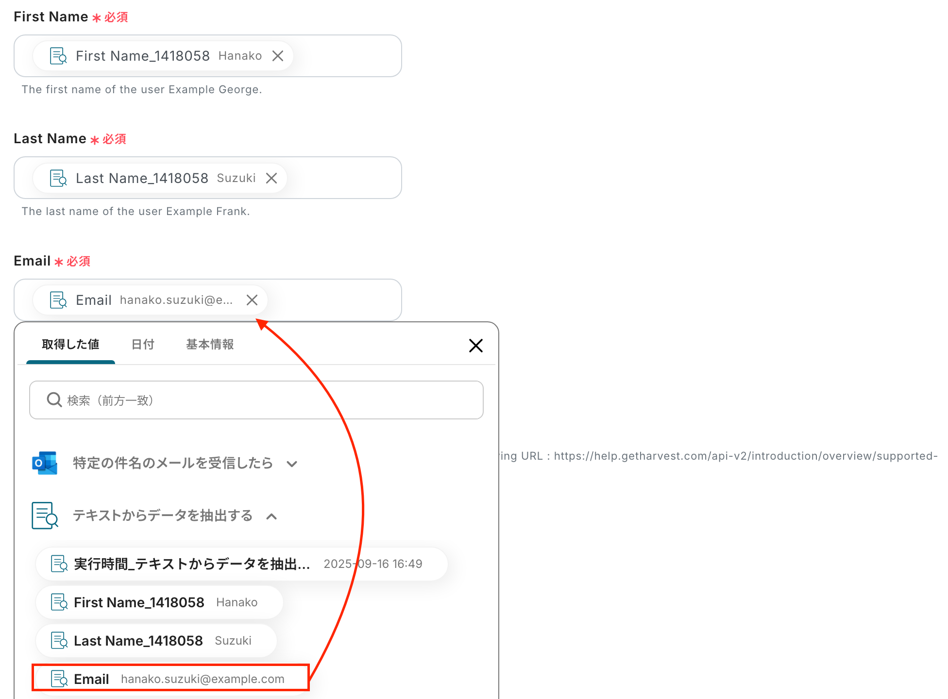 これにより、Outlookのメールごとに変わる情報をHarvestへ動的に反映できます。