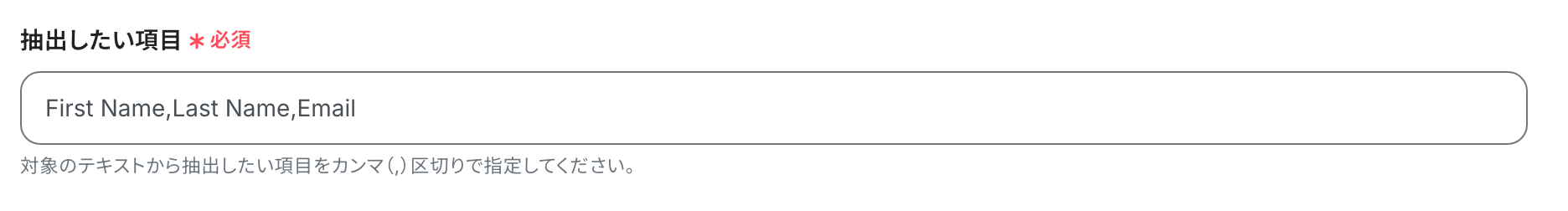 「抽出したい項目」:対象のテキストから抽出したい項目をカンマ(,)で区切り、指定。