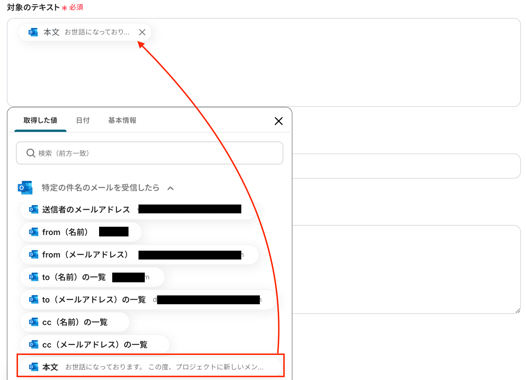 「対象のテキスト」:入力欄をクリックして表示されるアウトプットから「本文」を選択。