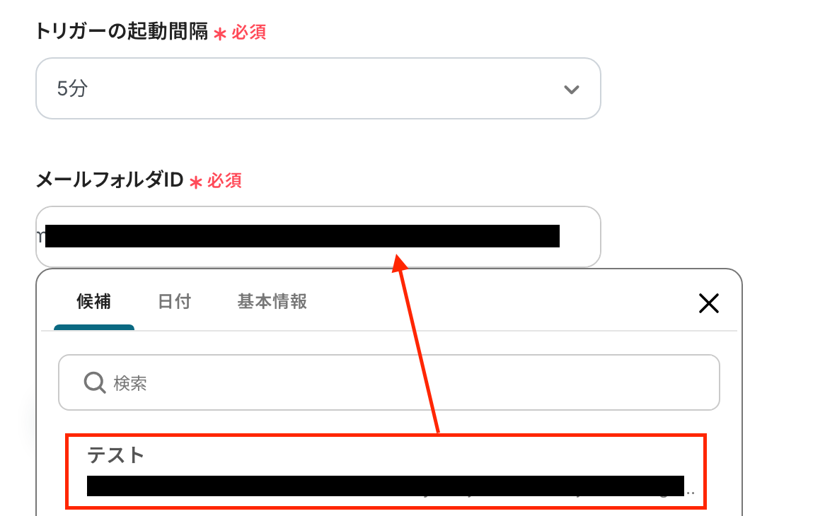 「メールフォルダID」:入力欄をクリックして表示される「候補」から選択します。