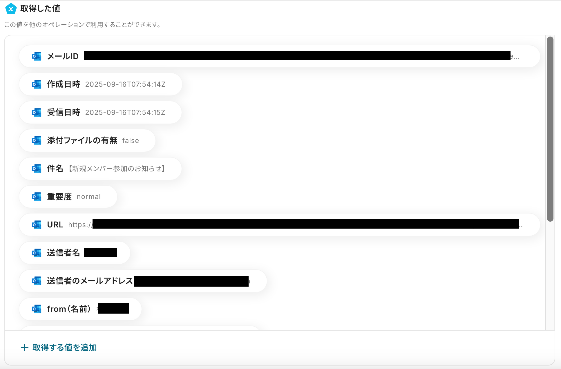 テストに成功すると、Outlookから取得した内容が取得した値に表示されます。