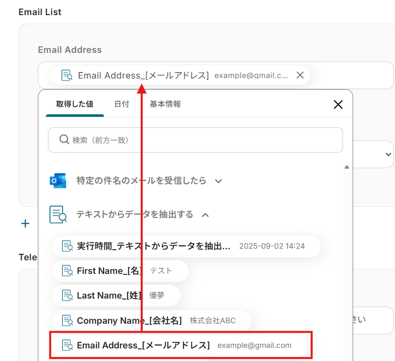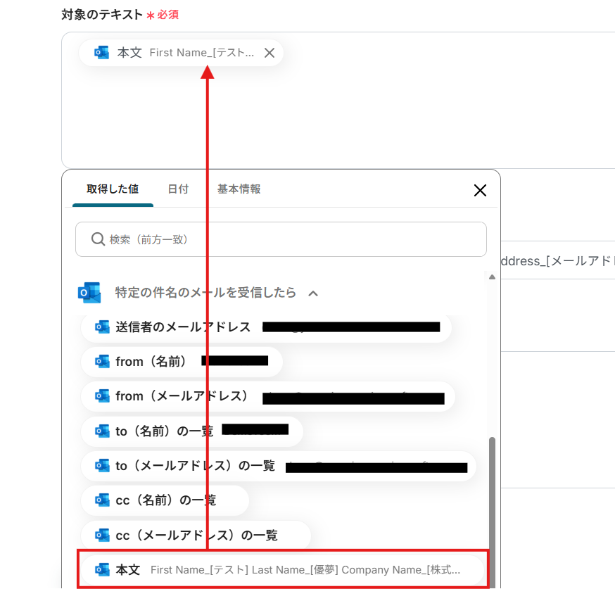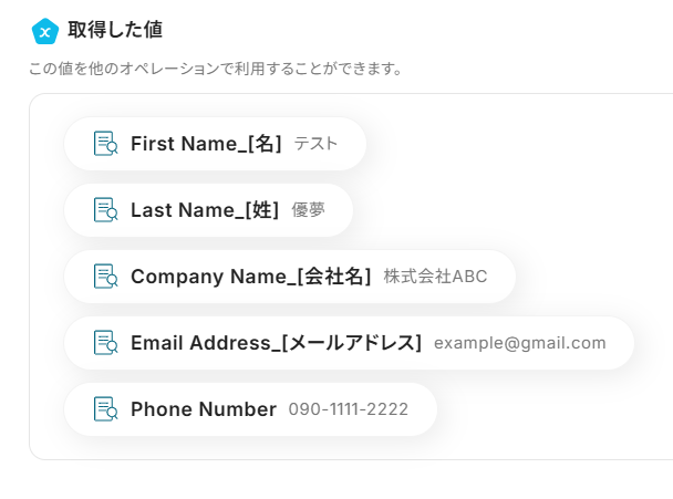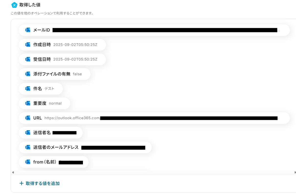 トリガーやオペレーション設定時に、「テスト」を実行して取得した値です。