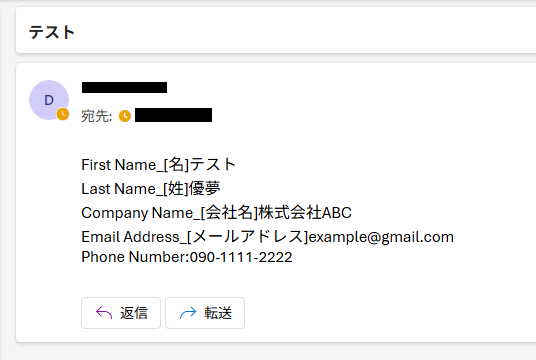 テスト用のため、メール内容は架空の情報(「株式会社test」や「テスト太郎」など)でOKです!