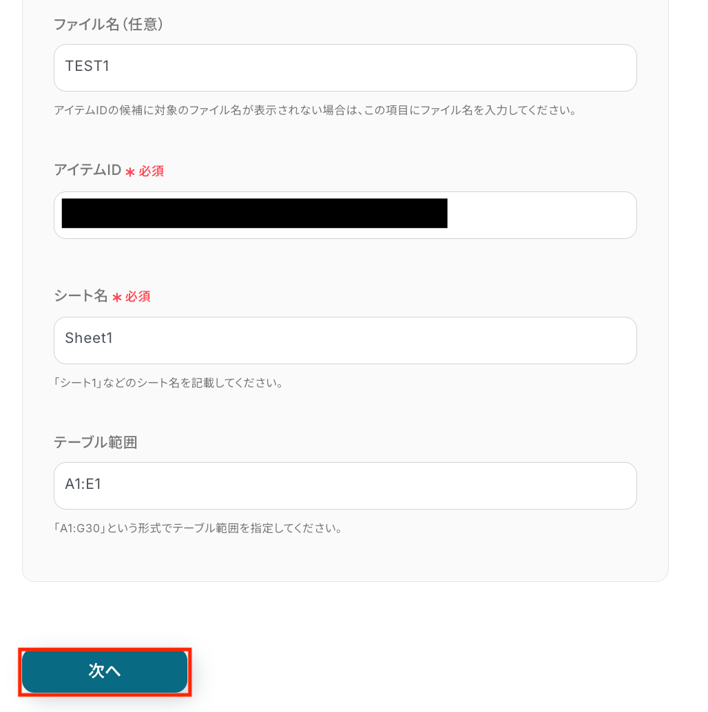 ファイル名やシート名、範囲を入力し「次へ」を押します。