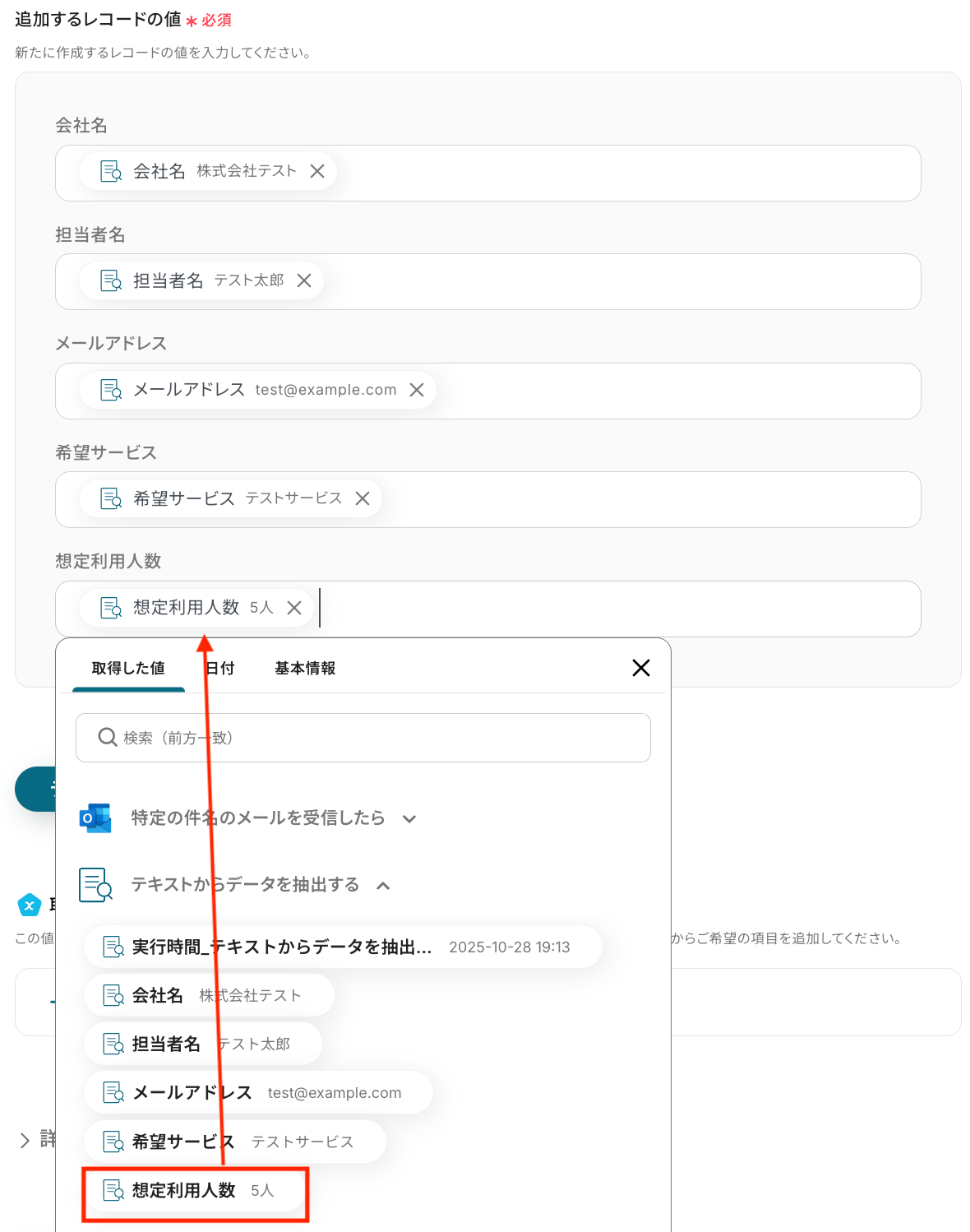 トリガーやオペレーション設定時に、「テスト」を実行して取得した値のことを指します。後続のオペレーション設定時の値として利用でき、フローボットを起動する度に変動した値となります。
