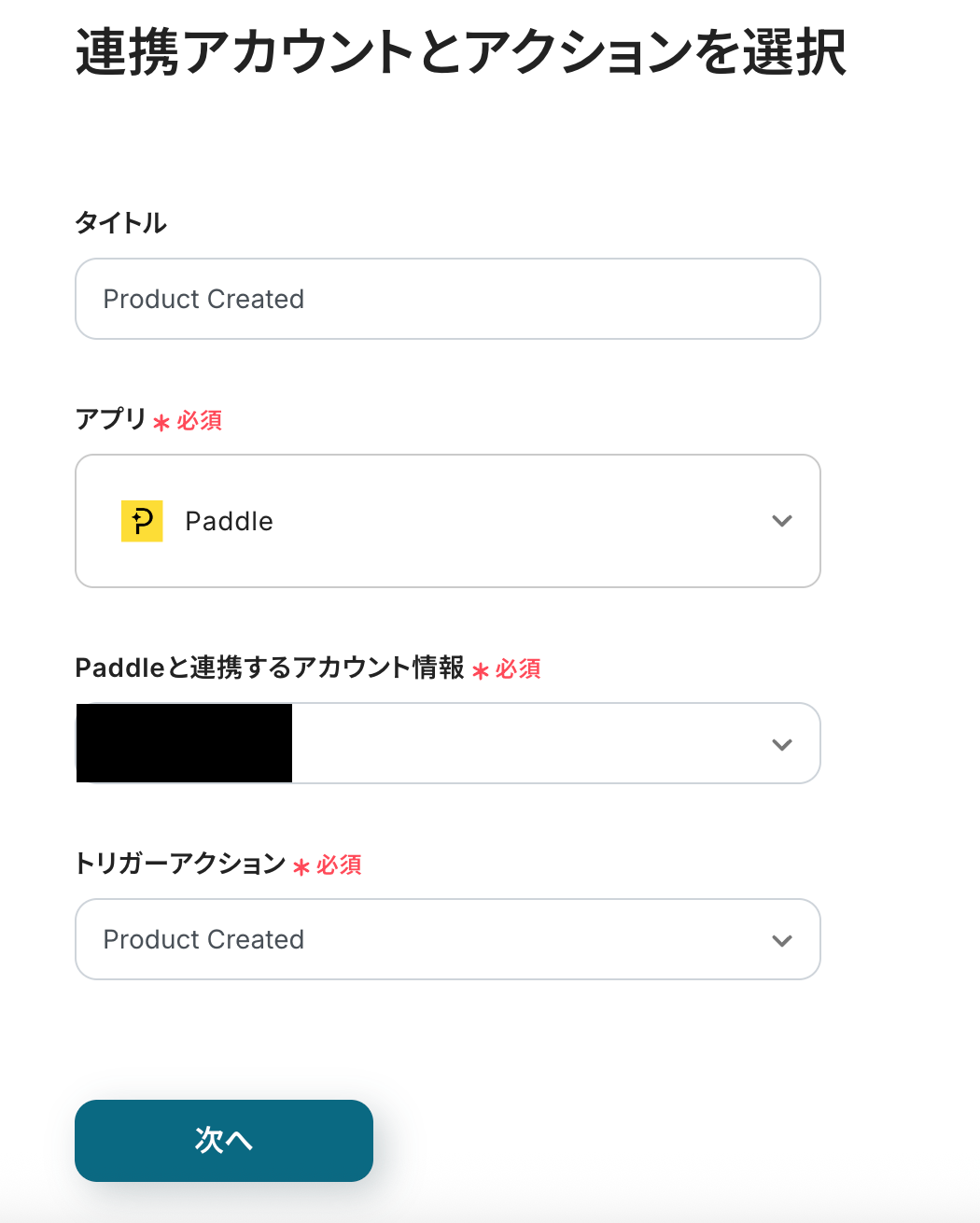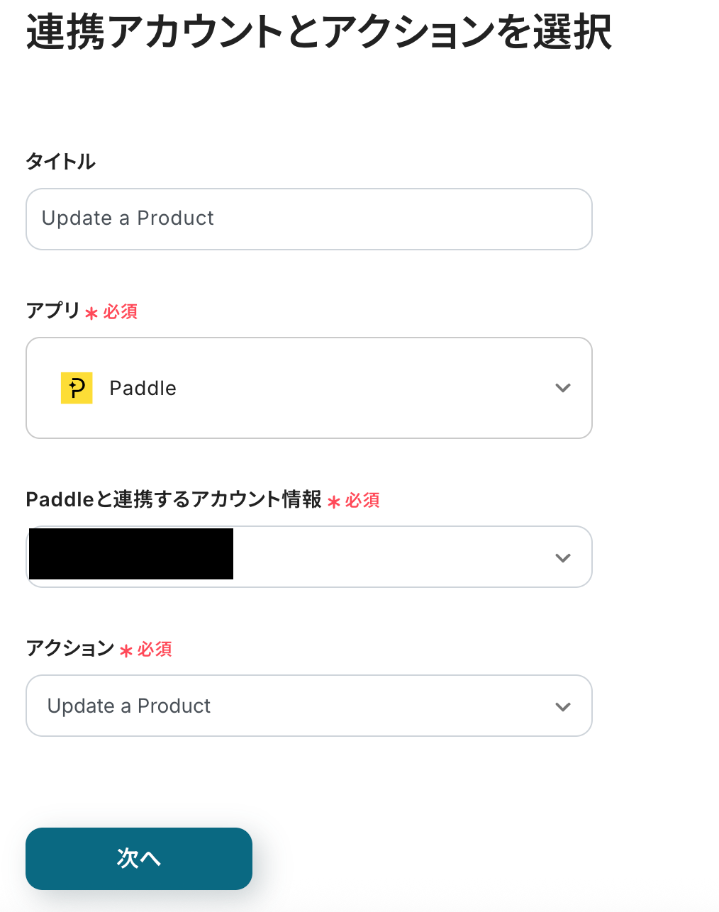 連携アカウントとアクションを選択する画面は、以下を確認し、次へをクリックしてください。