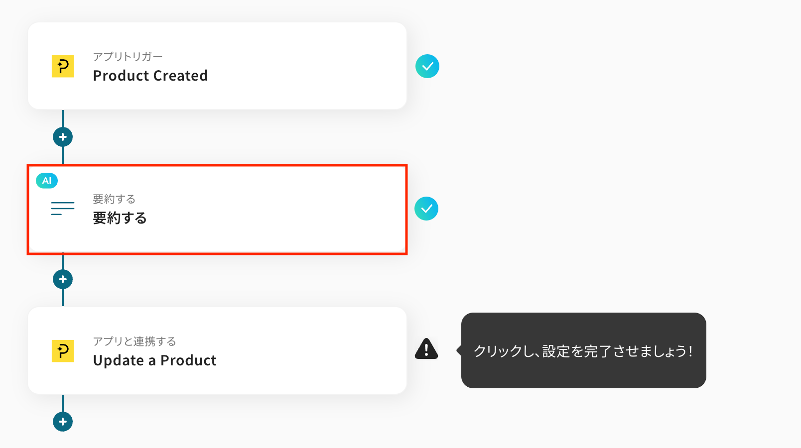 次に「要約」をクリックして、設定を進めていきましょう! このアクションを設定することで、先ほど登録したプロダクト情報を簡潔な文章に整えることができます。
