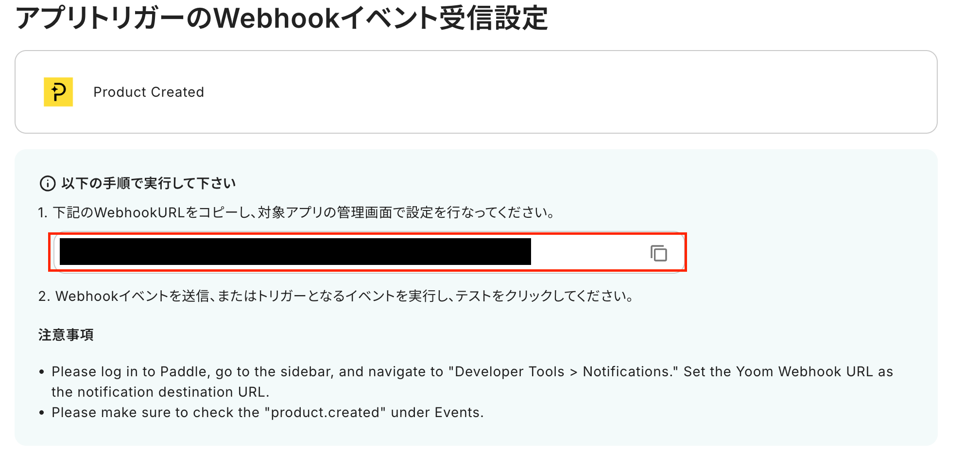 アプリトリガーのWebhookイベント受信設定を行います。 表示されているWebhookURLをコピーして、Paddleの管理画面で設定してください。