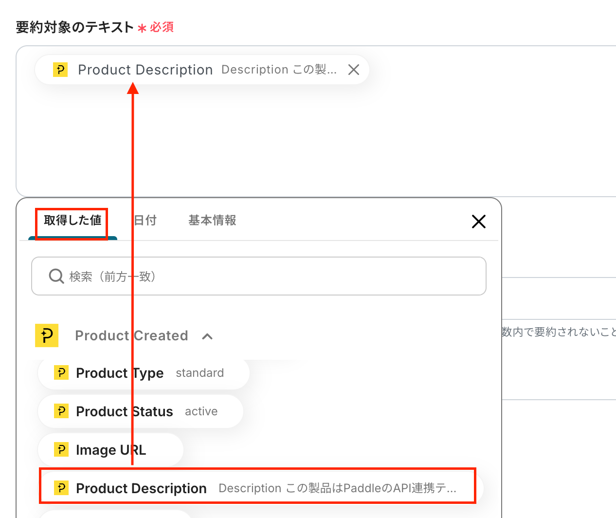 AI機能の「要約する」アクションでは、要約したい文章として前のステップで取得したPaddleの商品情報を変数として設定し、要約の条件なども任意でカスタマイズが可能です。 Paddleの「商品を更新する」アクションでは、更新したい項目に対して、AIが生成した要約内容などの変数を設定したり、固定のテキストを入力したりと柔軟に設定できます。 ■注意事項
