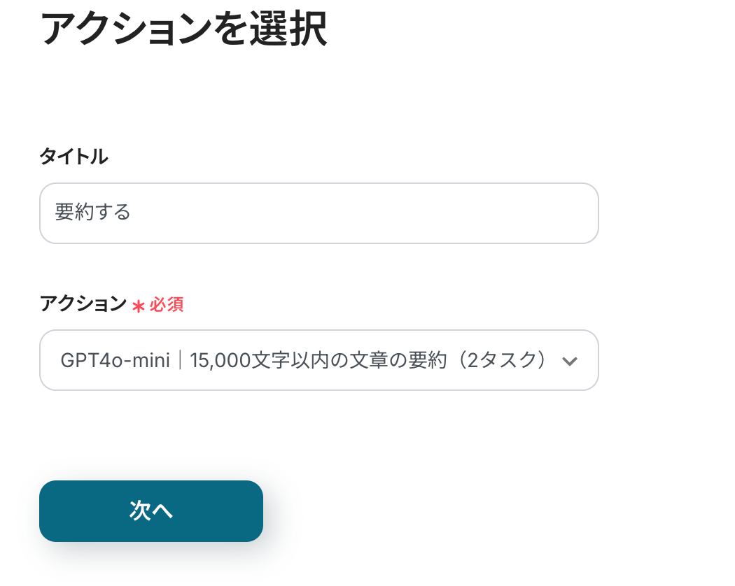 アクションは「15,000文字以内の文章の要約」が選択されています。