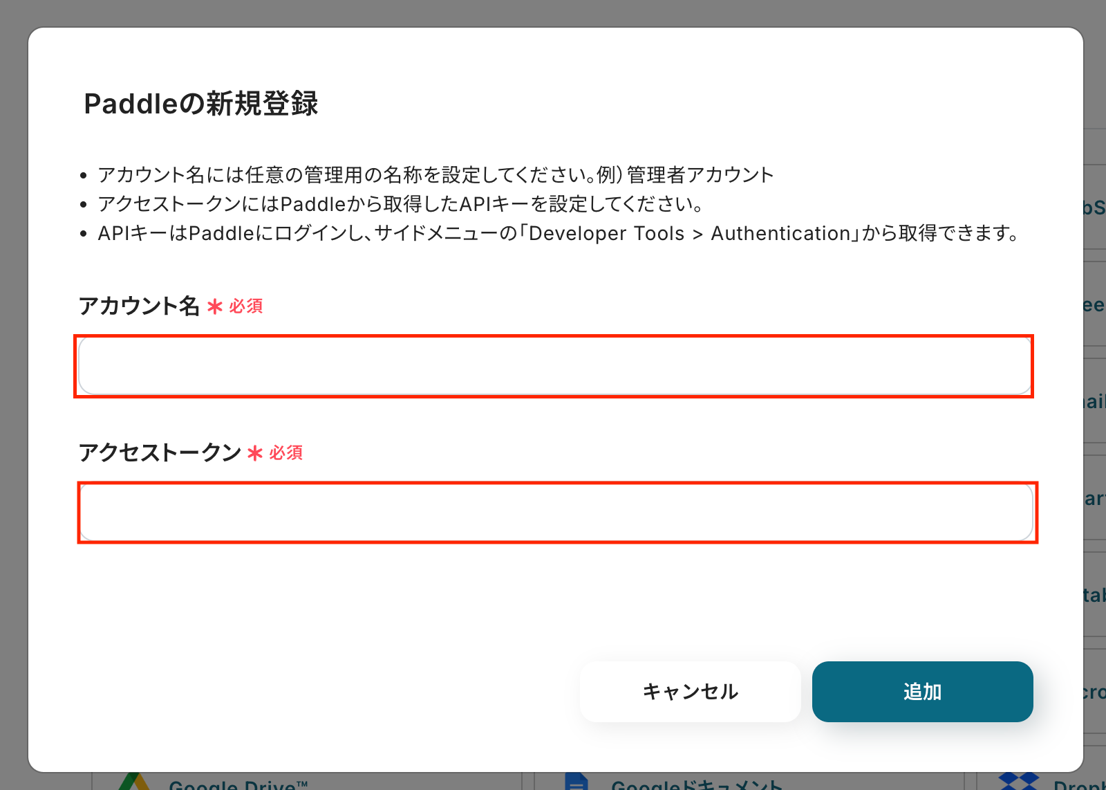 アクセストークンは注釈に記載されているように、Paddleにログインして確認します。