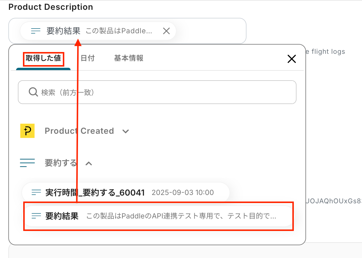 Product Descriptionでは、「要約する」の取得した値から、要約結果を選択しましょう。 設定後、テストをクリックします。