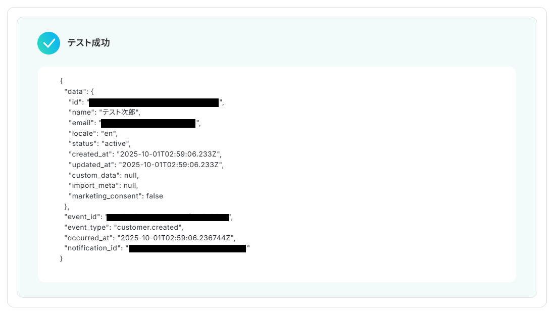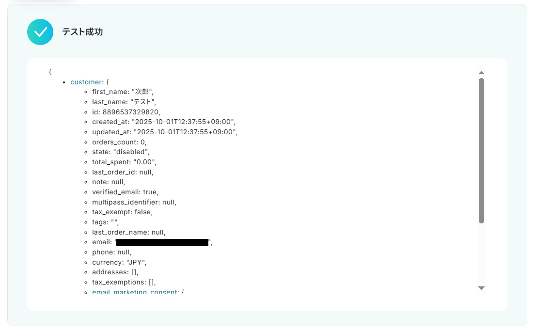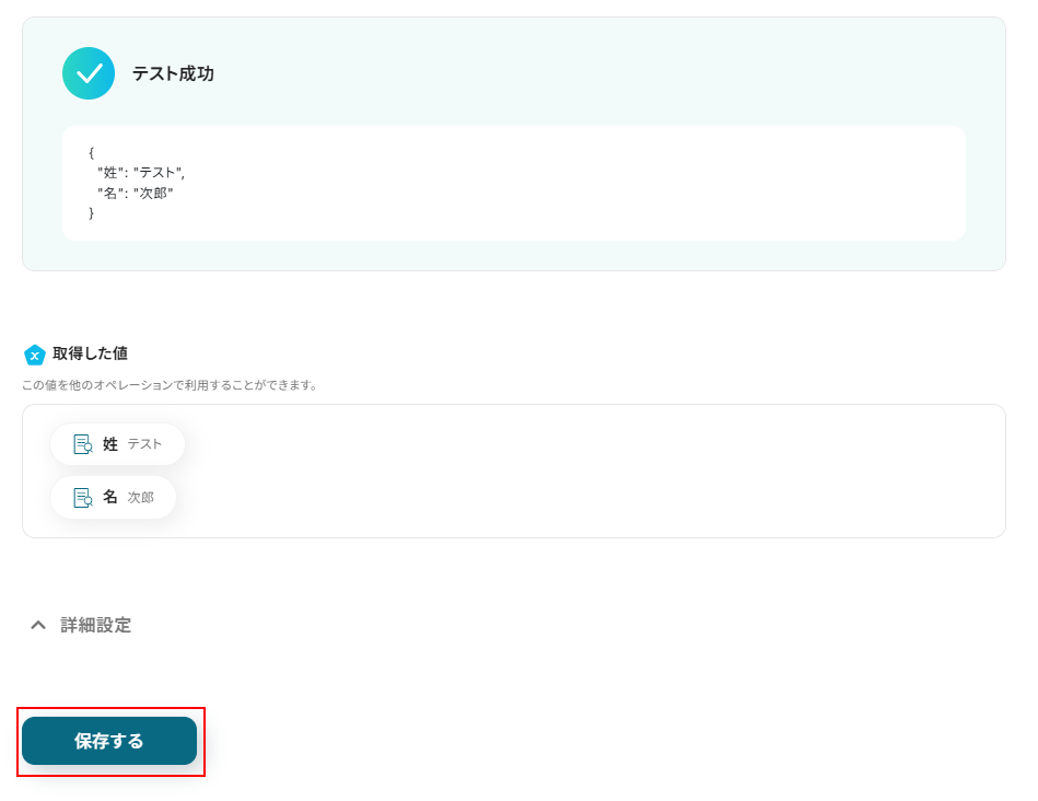 テストに成功するとテスト成功画面が表示され、取得した値が表示されます。