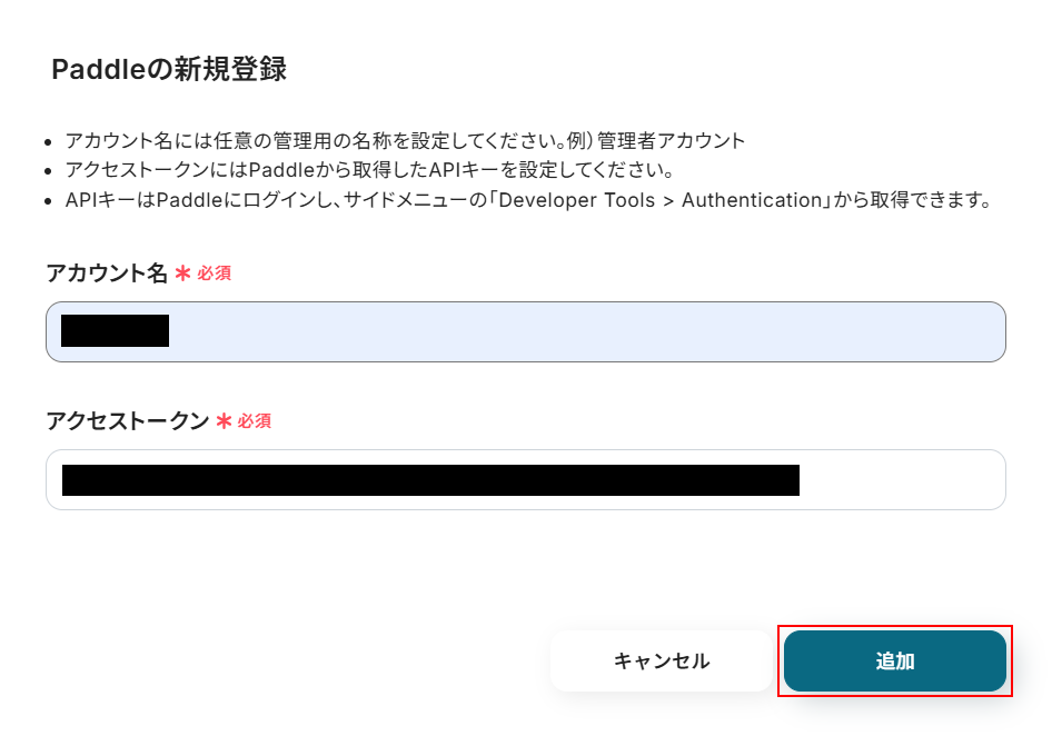 表示内容を確認し、アカウント名、アクセストークンを入力します。入力できたら「追加」をクリックしましょう。