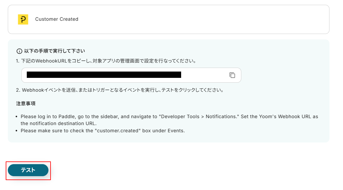 ここまで設定できたらYoomの画面に戻り、「テスト」をクリックしてください。