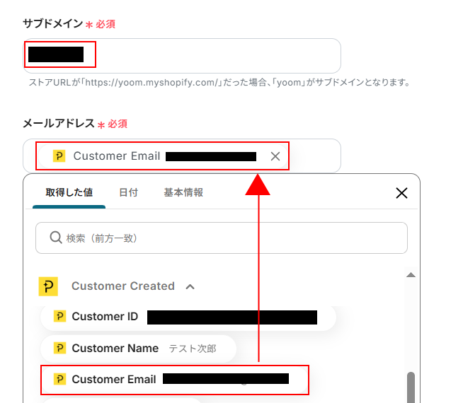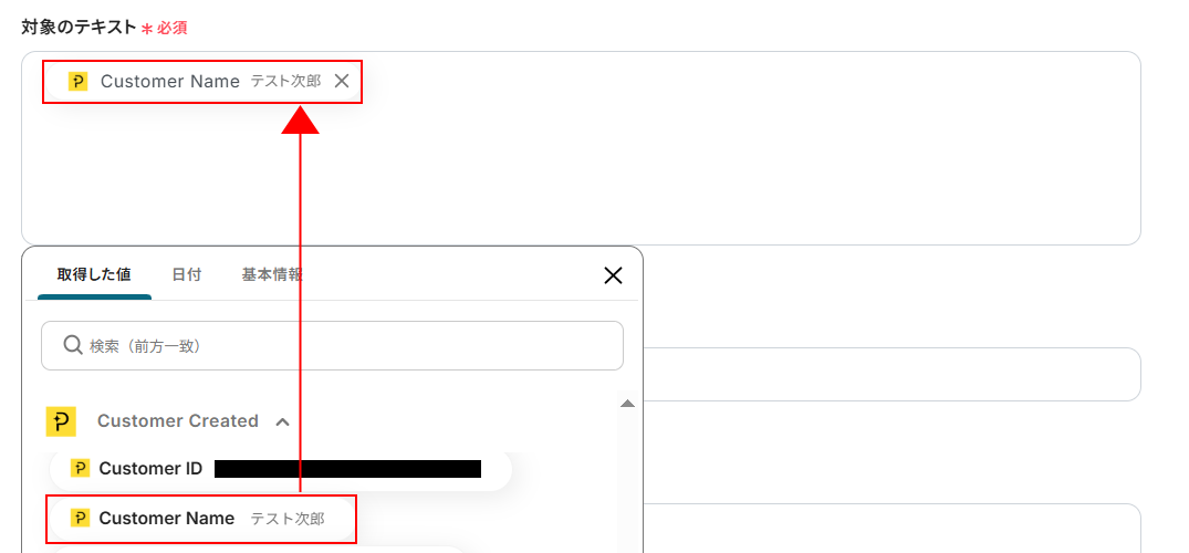 デフォルトでCustomer Nameが設定されています。今回はそのまま使用しますが、以下のように入力欄をクリックすることで取得した値から選択することも可能です。