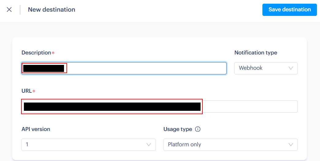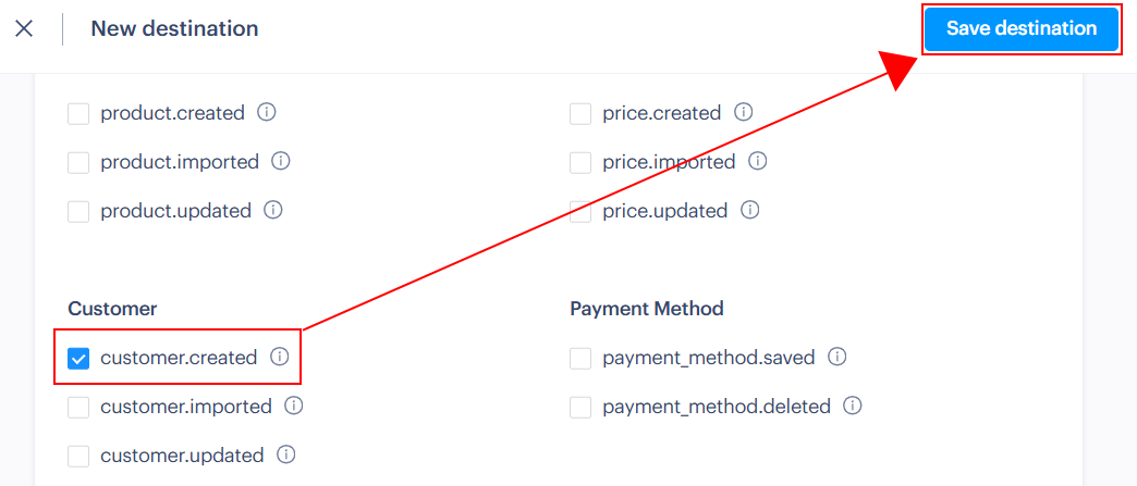 そのまま下に移動しcustomer.createdにチェックを入れたら、「Save destination」をクリックしましょう。