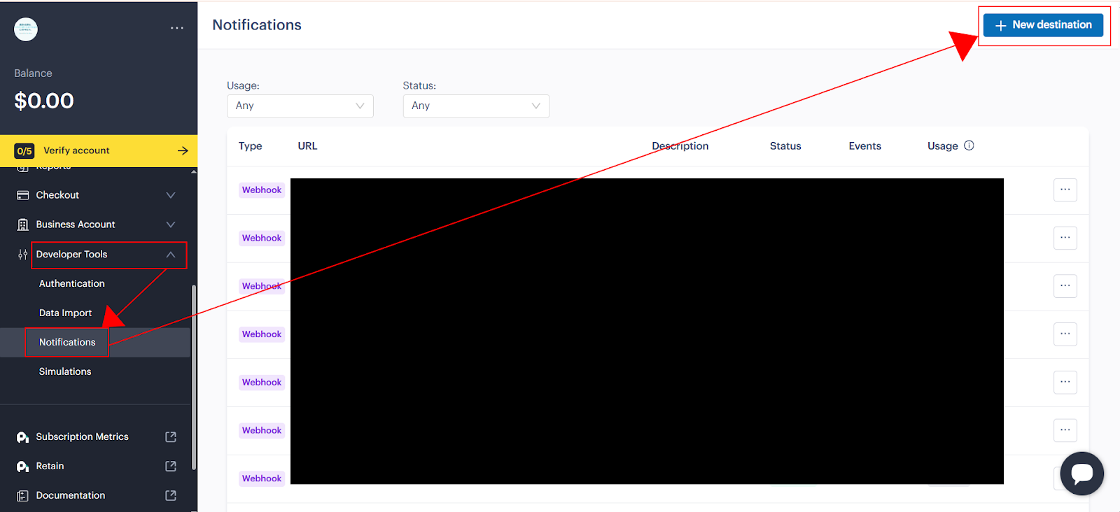 Paddleの画面に移動し、画面左にある「Developer Tools」の「Notifications」をクリックし、右上にある「+New destination」を選択します。