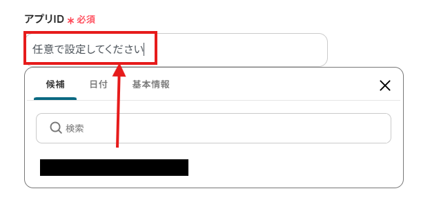 「アプリID」「データベースID」は、入力欄をクリックして表示される候補から選択してください。