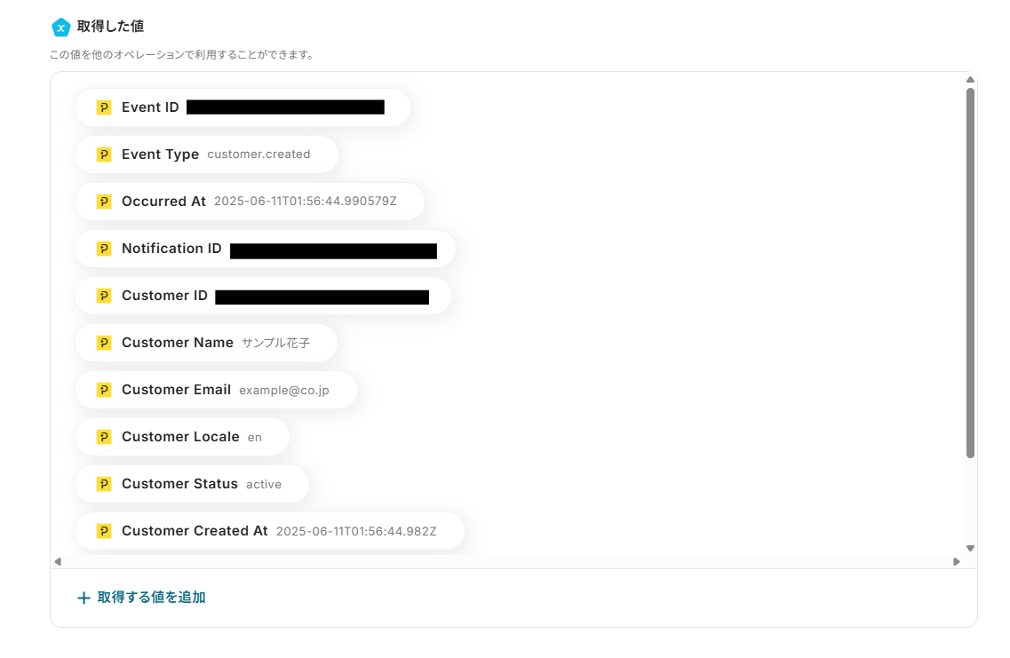 トリガーやオペレーション設定時に、「テスト」を実行して取得した値です。