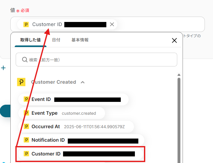 「値」は、入力欄をクリックして表示される取得した値から選択してください。