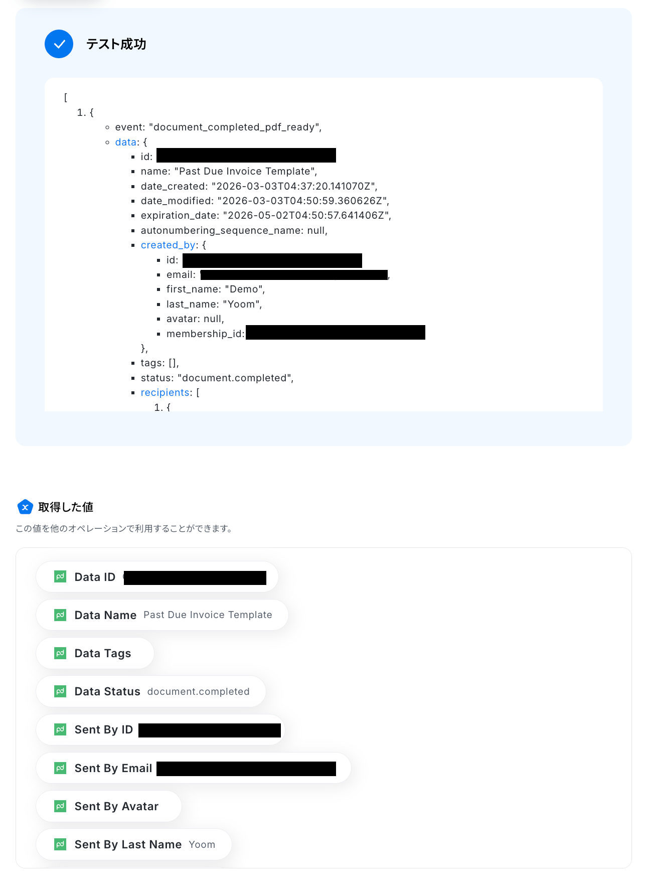 - 続けて、オペレーションでPandaDocの「完了したドキュメントをダウンロードする」アクションを設定し、契約書ファイルを取得します。