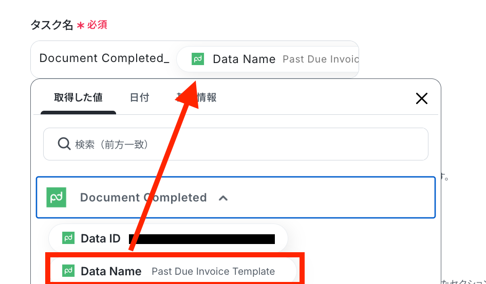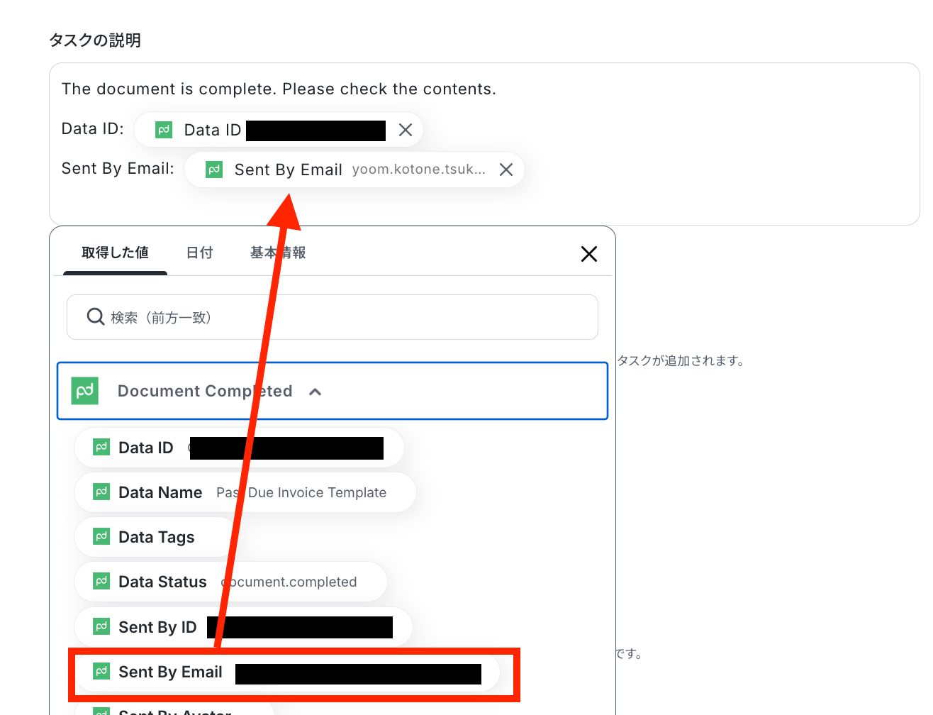 - タスクのタイトルや詳細には、トリガーのPandaDocから取得したドキュメント名や契約者情報といった動的な情報を自由に組み込むことが可能です。
