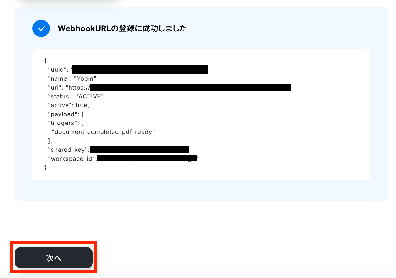 WebhookURLの登録に成功したことが確認できたら、「次へ」ボタンで次のページへ進みます。