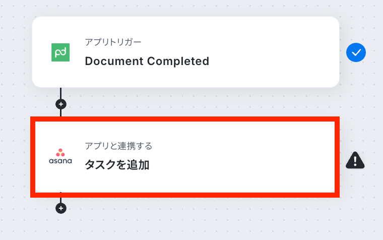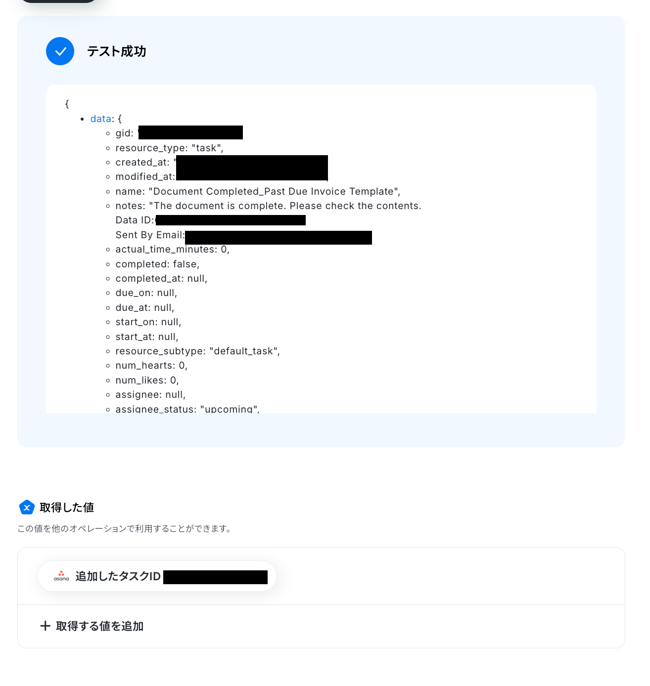 - 最後に、オペレーションでAsanaの「タスクを追加する」アクションを設定し、署名されたドキュメントの情報を基にタスクを追加します。