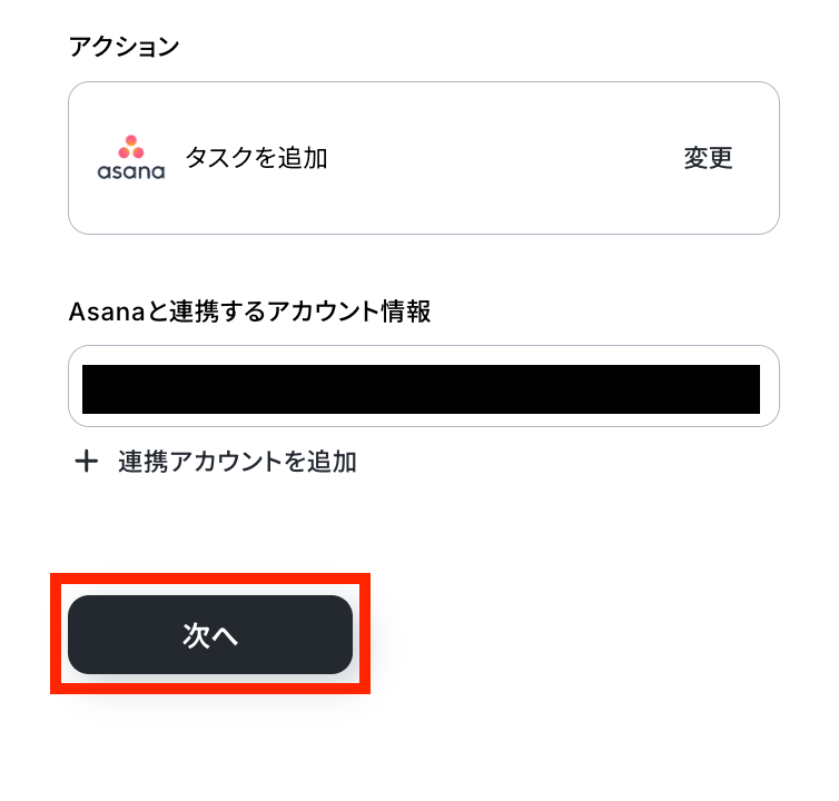 次に取得した値を利用してAsanaでタスクを追加するためのアクション設定をしていきます。2つ目の赤枠をクリックします。