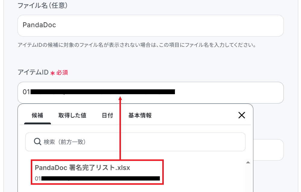 続けて、アイテムID も候補から選択します。候補が表示されない場合、ファイル名(任意) の欄に該当ファイル名の一部を入力してみてください。