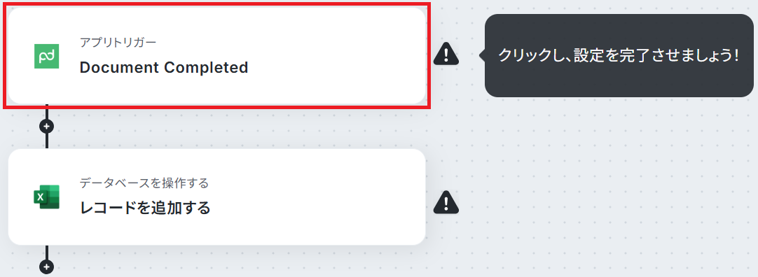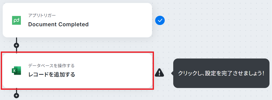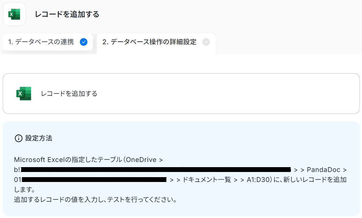 PandaDocのトリガー設定では、「Document Completed」を検知するための任意のWebhook Nameを設定してください。 Microsoft Excelのオペレーション設定では、レコードを追加したいExcelファイルが保存されている場所や対象のシートを任意で設定してください。 ■注意事項