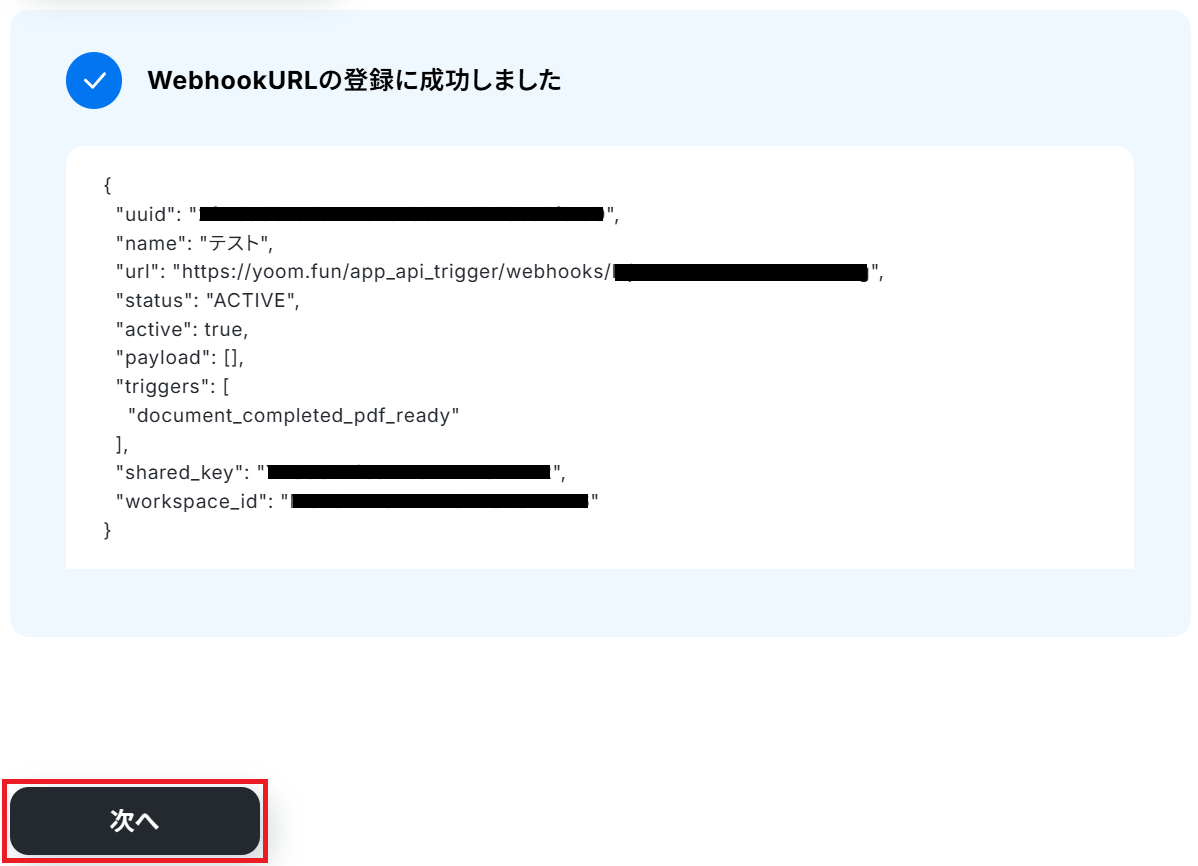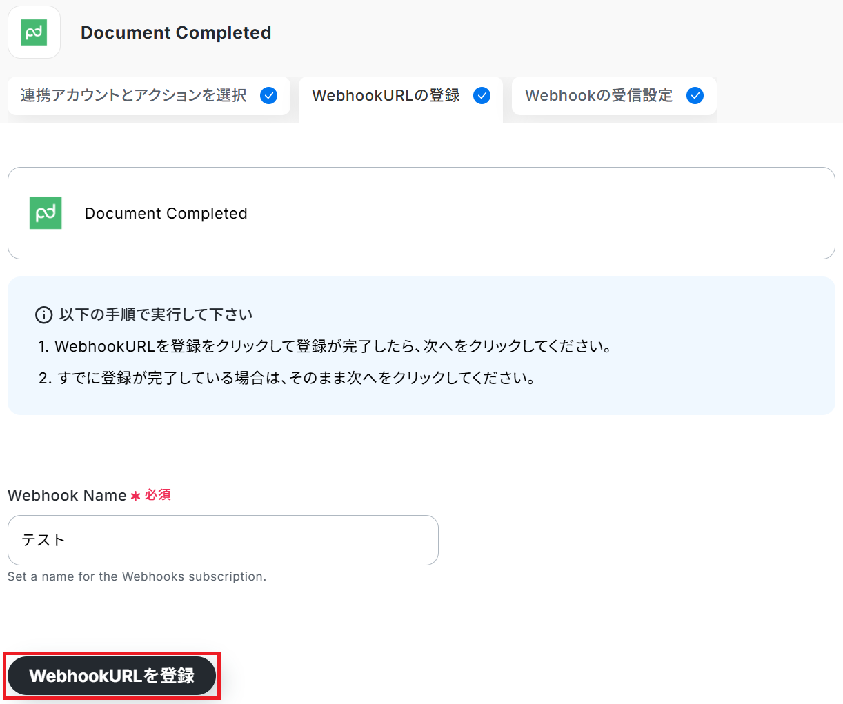 まず、任意のWebhook Name を入力し「WebhookURLを登録」をクリックしましょう。 ※既に登録が完了している場合は、そのまま「次へ」をクリックしてください。
