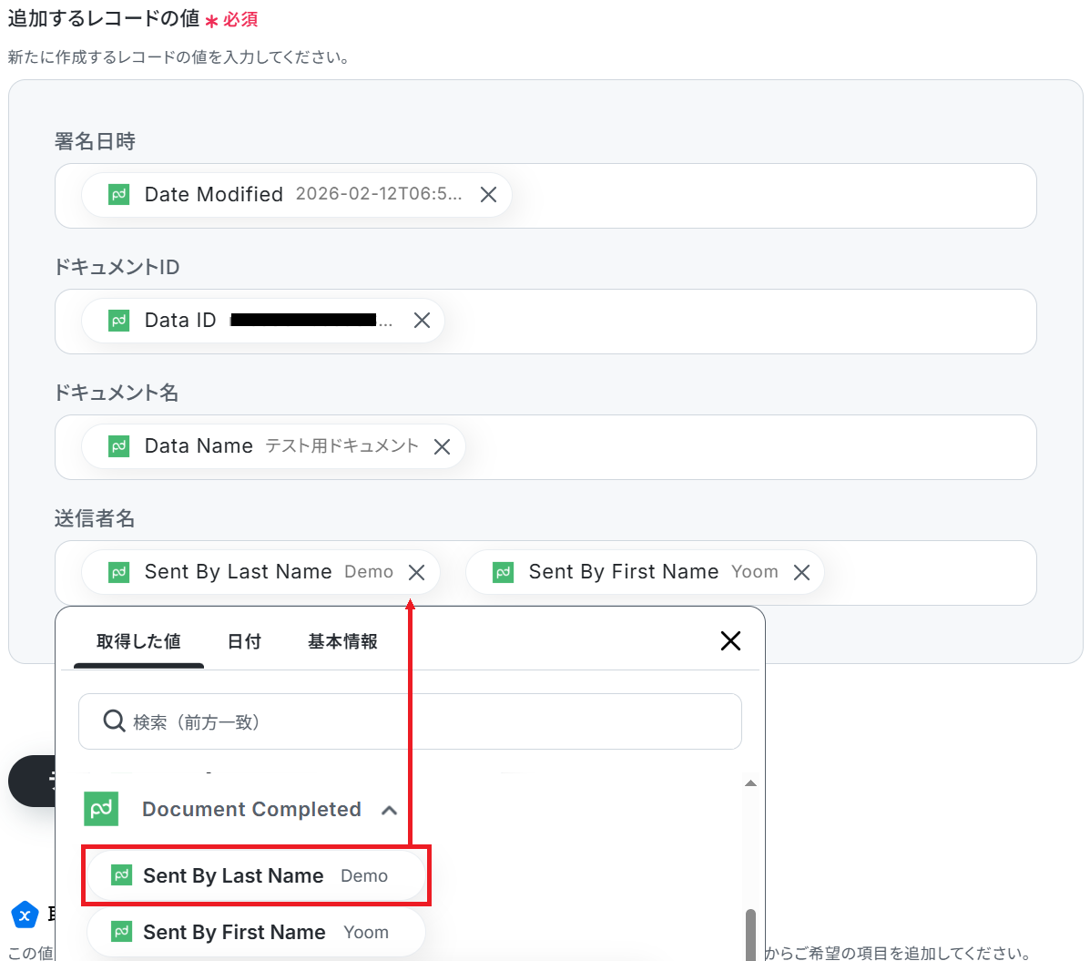 あとは先ほど用意したシートのヘッダーに対応する項目を選択していきましょう。 PandaDocから取得した値を選択することで、トリガーが実行されるたびに最新のドキュメント情報を反映できます。全ての項目を埋めたらテストしてください。