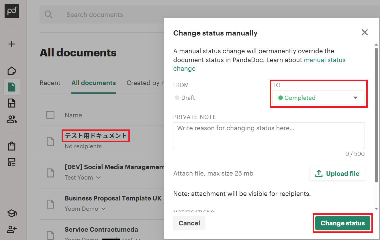 ここまできたら一旦PandaDocに移り、任意のドキュメントのステータスを「Completed」に更新しましょう。