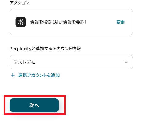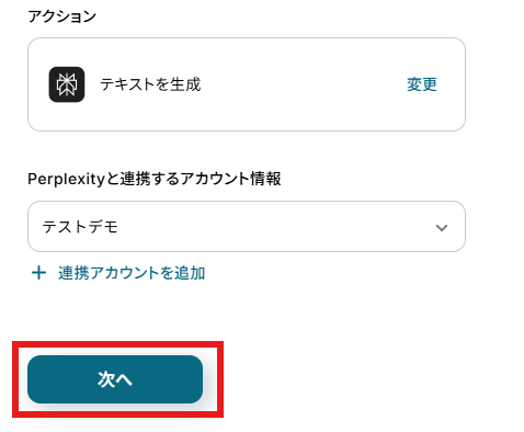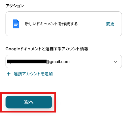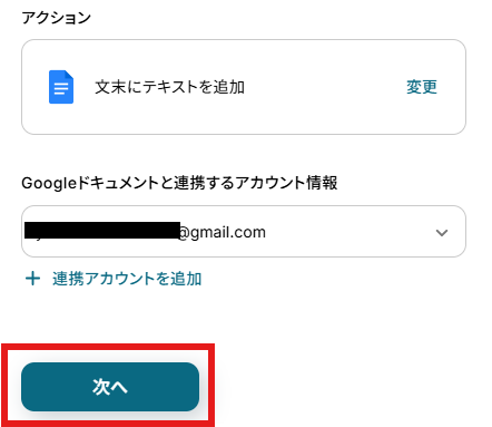 アクションはデフォルト設定のまま、アカウント情報は、連携したいアカウントが選択されているか確認してください。確認出来たら「次へ」をクリックしましょう。