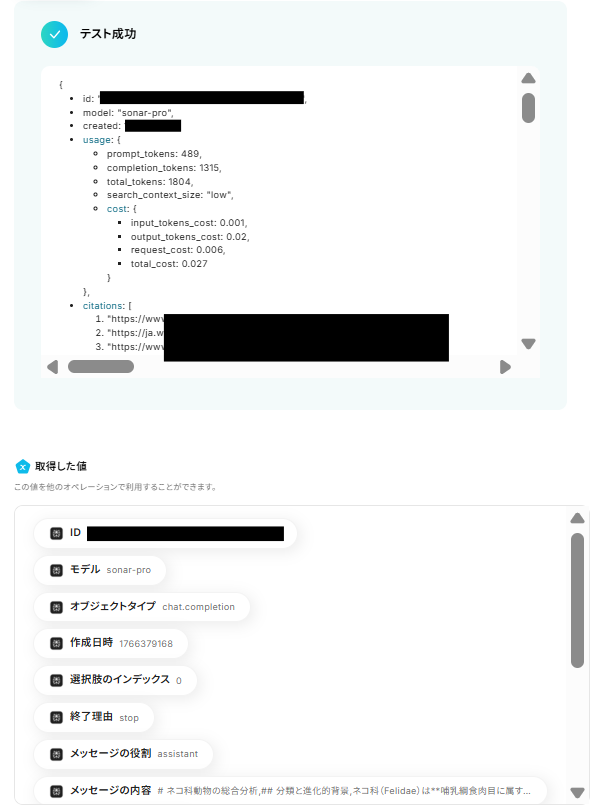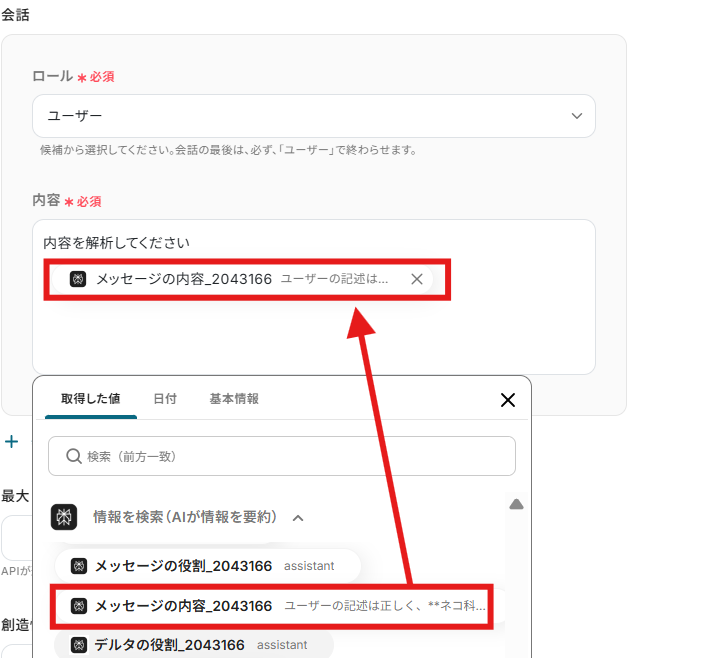 取得した値より:情報を検索(AIが情報を要約)のメッセージの内容