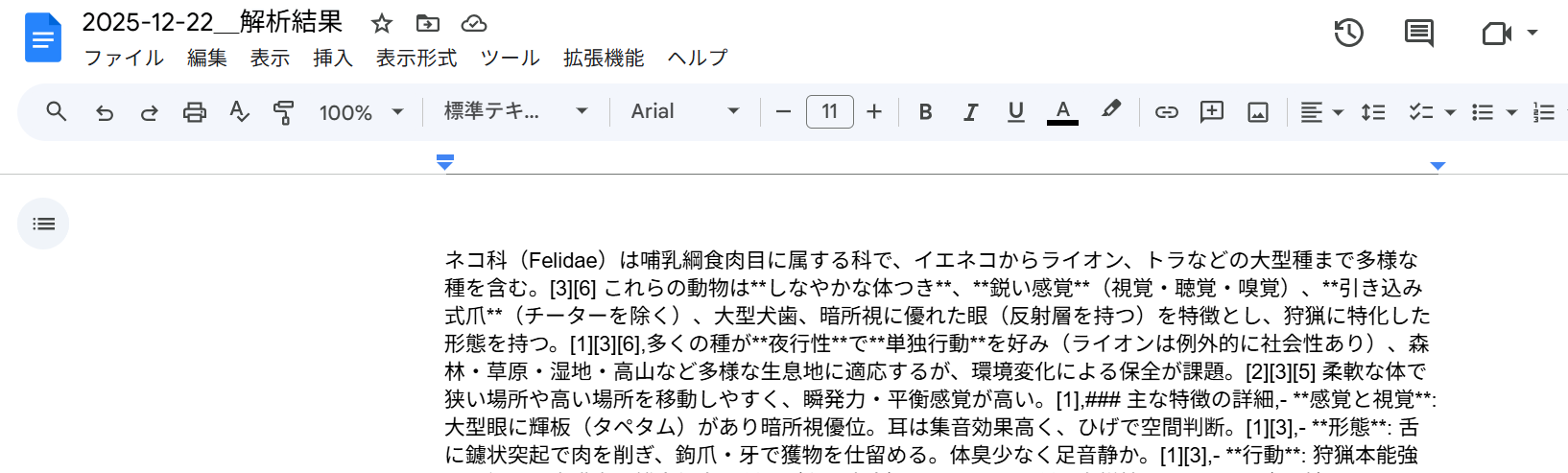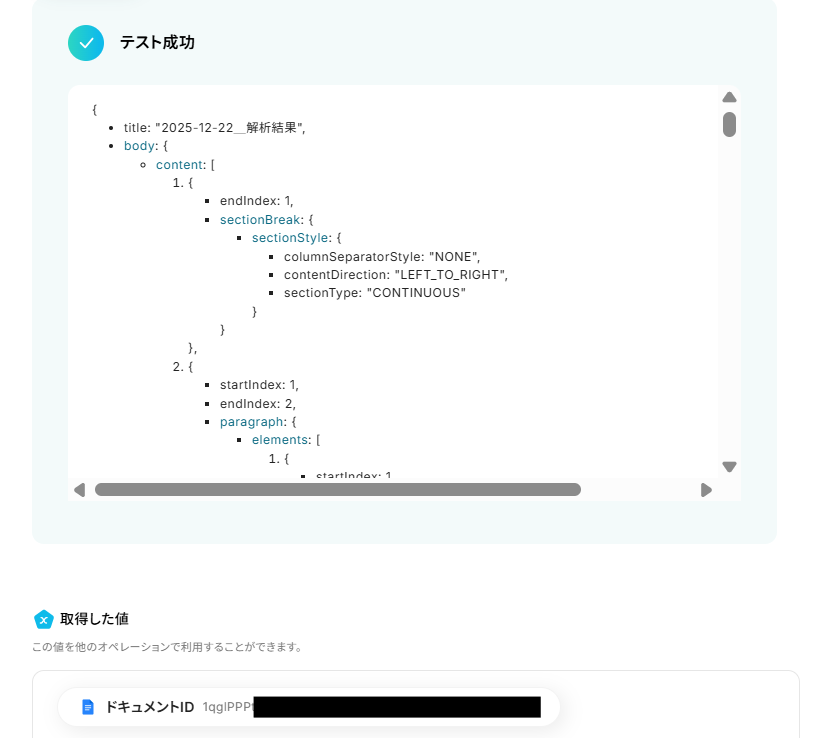 上記の入力が完了したらテストボタンを押してみましょう。テストが成功し、Google ドキュメントに解析結果が追記されます。