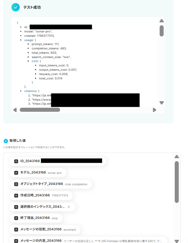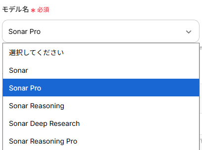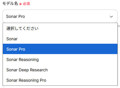 解析するAIのモデル名を指定します。今回は「Sonar Pro」にしましたが、お好みのものをお使いください。