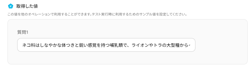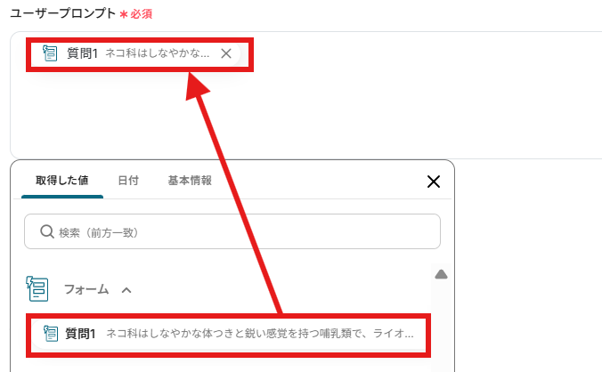 ユーザープロンプトは前ステップで取得した質問の内容を、「取得した値」から選択します。