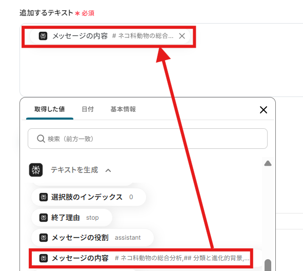 追加するテキストには「テキストを生成」の取得した値から「メッセージの内容」を入力しましょう。