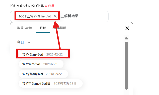 ドキュメントを作成する際のタイトルを入力します。今回は日付を使ってわかりやすく記載してみました。必要に応じて取得した値なども使ってみてください。