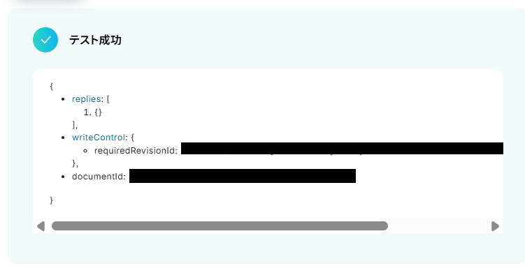 上記の入力が完了したらテストボタンを押してみましょう。テストが成功し、Google ドキュメントが作成されます。