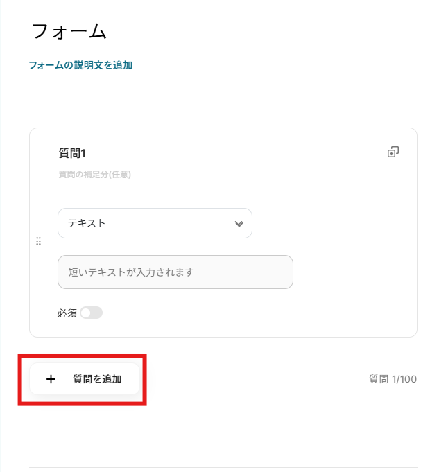 今回はデフォルトで「質問」が入力できるフォームとなっています。 さらに設問を追加したい場合は「質問を追加」から行ってください。