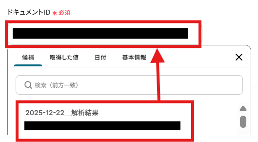 前ステップで作成したGoogle ドキュメントのIDを、候補から選んで「ドキュメントID」に入力します。